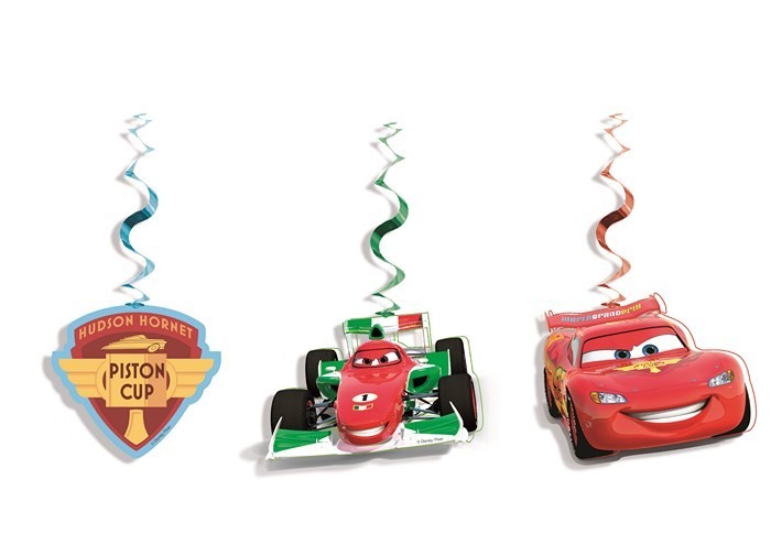 Embalagem de 3 espirais decorativas sortidas, com imagens das personagens do Faísca Cars, para a decoração das festas de aniversário.