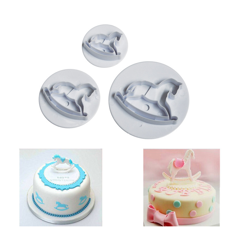Pack de 3 Cortadores de bolachas em plástico, em forma de cavalinhos de baloiço. Pode ainda ser utilizado para decoração de bolos de aniversário.