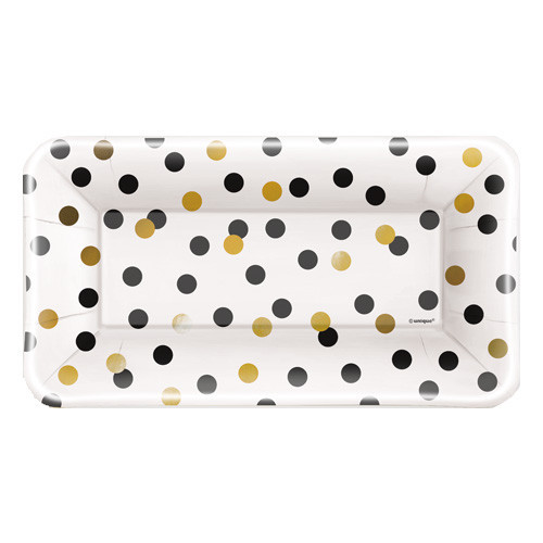 Um pack composto de 8 tabuleiros rectangulares de cartão, ideal para festas em preto e dourado ou para uma passagem de ano.