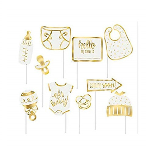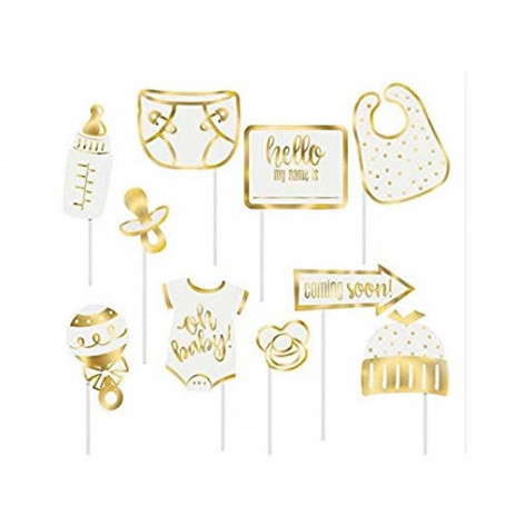 Pack para fotografias inesquecíveis para baby showers com 10 elementos diferentes em branco e dourado.