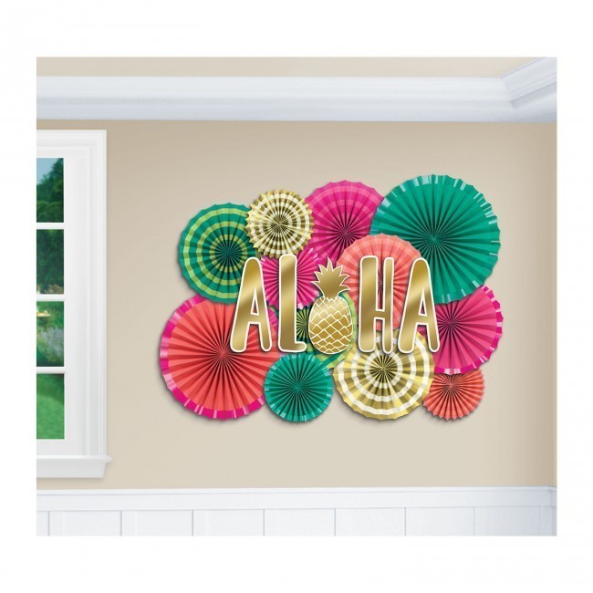 Inclui: 2 decorações de 40.6cm de diâmetro, 6 decorações de 30.4cm de diâmetro, 4 decorações de 20.3cm de diâmetro e ainda 4 letras e 1 ananás de 30.4cm recortados individualmente para formar a palavra "ALOHA".