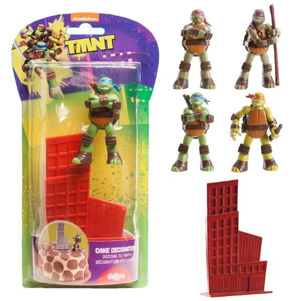 Para decoração de bolo de aniversário, uma figura das Tartarugas Ninja e um prédio. A figura da tartaruga é enviada aleatoriamente.