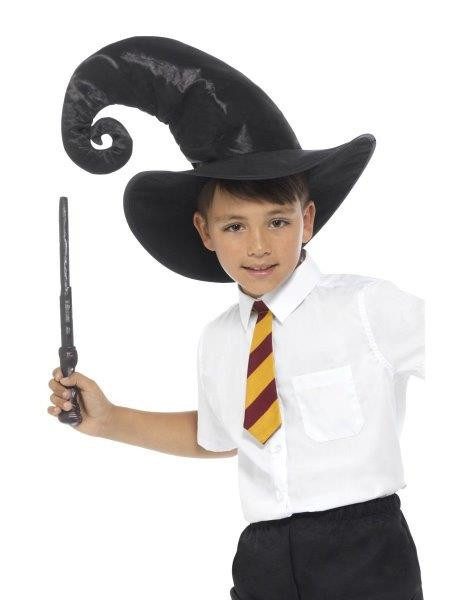 Conjunto de chapéu, varinha e gravata do Harry Potter para complementar o disfarce.