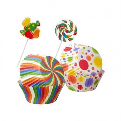 Conjunto de 50 forminhas de papel para bolinhos cup cake (25 de cada modelo) com 24 palitos decorativos (12 de cada modelo), da marca Wilton