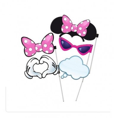 Conjunto de 5 acessórios para tirar divertidas fotografias com o tema Minnie Mouse. Tire fotos com este kit que inclui vários acessórios engraçados