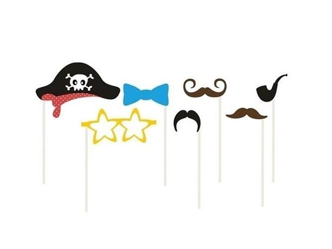 Conjunto de 10 acessórios para tirar divertidas fotografias com o tema Piratas. Tire fotos com este kit que inclui labios, chapéu pirata, pala pirata, balão animado, lenço pirata, gancho, papagaio, barba e dois bigodões diferentes.