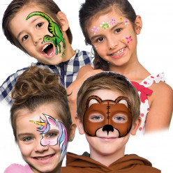 Kit completo de pinturas faciais Ultimate Party composto por 10 cores de 1 gr (Vermelho, Azul, Verde, Amarelo, Rosa, Lilás, Castanho, Laranja, Prata e Dourado), 2 cores de 2gr (Preto e Branco), 2 x Tubo Gel Glitter 11ml (Transparante e Prata), folheto de instruções, 1 pincel, 1 aplicador e 4 esponjas num total de 21 peças. Teste numa pequena área do corpo para saber se faz reação.