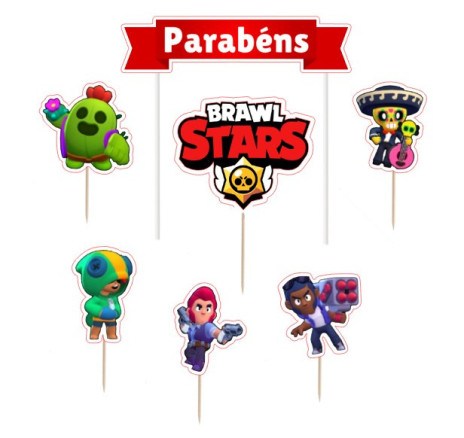 Conjunto de sete toppers para decoração de bolo de aniversário ou outros doces/salgados com o tema Brawl Stars.