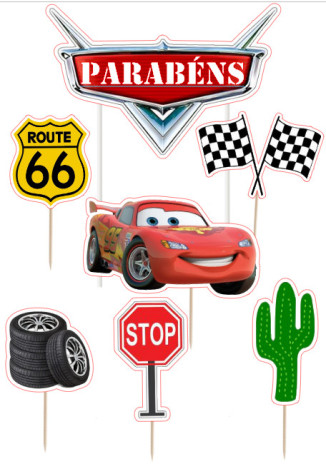Conjunto de sete toppers para decoração de bolo de aniversário ou outros doces/salgados com o tema do filme Cars, com o Faísca McQueen.