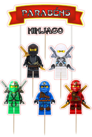 Conjunto de sete toppers para decoração de bolo de aniversário ou outros doces/salgados com o tema do Lego Ninjago.