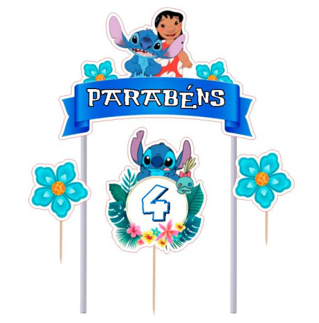 Kit topper de bolo Lilo e Stitch de 4 peças em que pode personalizar o nome e a idade.
