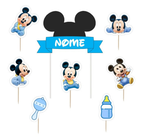Conjunto de topo de bolo personalizável e 7 toppers pequenos do Baby Mickey.