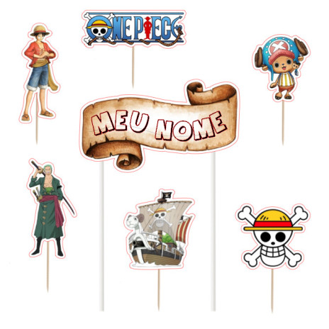Conjunto de sete toppers para decoração de bolo de aniversário ou outros doces/salgados com o tema do One Piece.