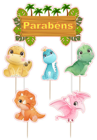 Conjunto de seis toppers para decoração de bolo de aniversário ou outros doces/salgados com o tema dos Pequenos Dinossauros.