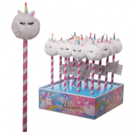 Lápis de carvão de Unicórnio peludo com orelhinhas e corninho.