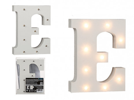 Letra E com iluminação com 8 Leds com 16cm de altura. Fabricado em MDF este artigo é ótimo para decoração de salas, quartos, aniversários ou outros eventos e pode ser utilizado de dois modos, livre em qualquer superfície ou suspenso na parede.