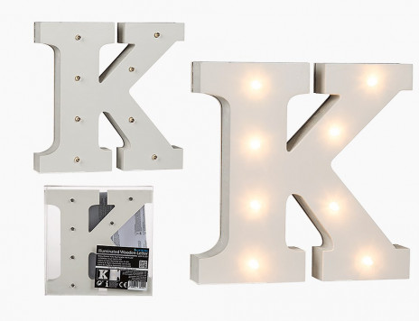 Letra K com iluminação com 8 Leds com 16cm de altura. Fabricado em MDF este artigo é ótimo para decoração de salas, quartos, aniversários ou outros eventos e pode ser utilizado de dois modos, livre em qualquer superfície ou suspenso na parede.
