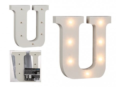 Letra U com iluminação com 8 Leds com 16cm de altura. Fabricado em MDF este artigo é ótimo para decoração de salas, quartos, aniversários ou outros eventos e pode ser utilizado de dois modos, livre em qualquer superfície ou suspenso na parede.
