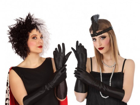 Luvas pretas para disfarce de carnaval. Têm cerca de 40cm e vão até ao cotovelo.