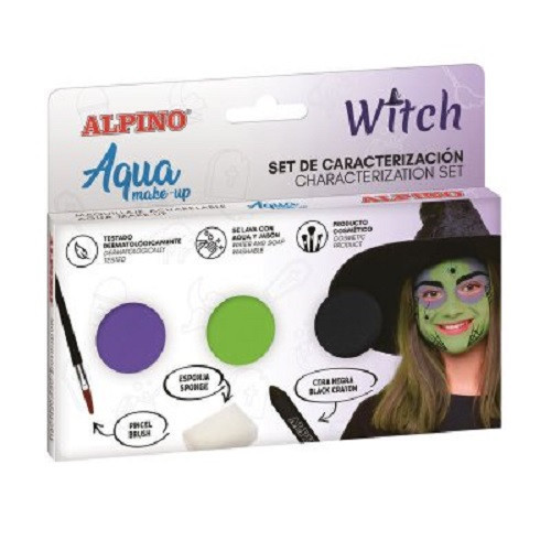 Kit de maquilhagem de bruxa para halloween ou carnaval. Inclui 1 lápis preto, 1 pincel, 1 esponja e 3 aquarelas.
