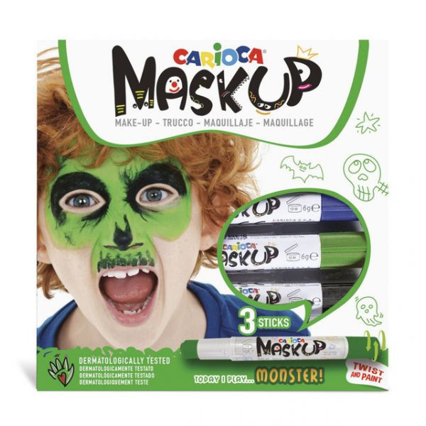 Conjunto de maquilhagem da Carioca Maskup para pinturas de monstro com 3 cores, azul, verde e preto com manual. A maquilhagem sai facilmente com água e sabão. Testado dermatologicamente.
