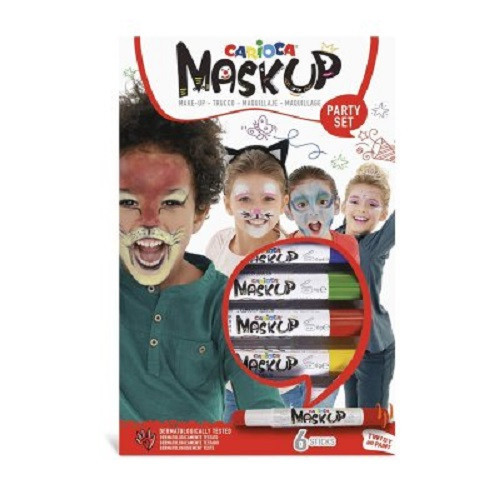 Conjunto de maquilhagem da Carioca Maskup para pinturas com 6 cores e manual. A maquilhagem sai facilmente com água e sabão. Testado dermatologicamente.