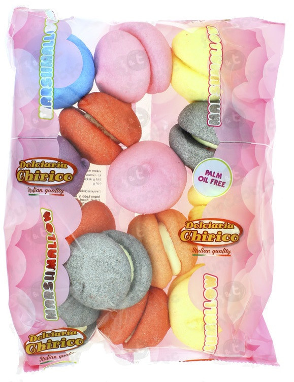 Embalagem de 700g de macarons gigantes em marshmallow com açúcar com cerca de 12 unidades.