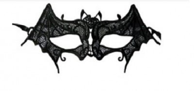 Máscara em renda preta rígida, para completar um fato ou simplesmente para criar uma fantasia original. A máscara tem o formato de um morcego.