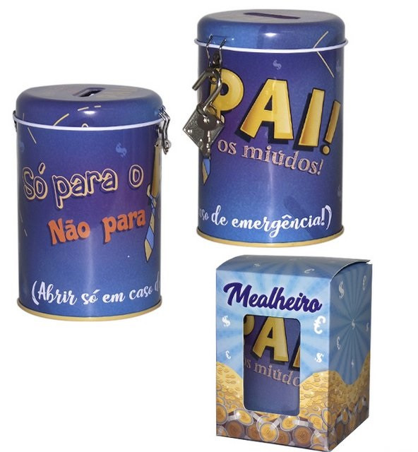 Mealheiro redondo em metal para oferecer no dia do pai e assim colocar as poupanças.