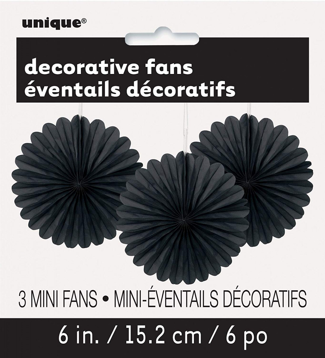 Conjunto de 3 leques ou rosetas de papel para pendurar e decorar na cor preta.