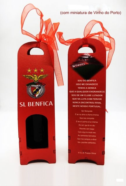 Uma garrafa pequena embrulhada numa caixa alusiva ao SLB e com a letra do hino do glorioso