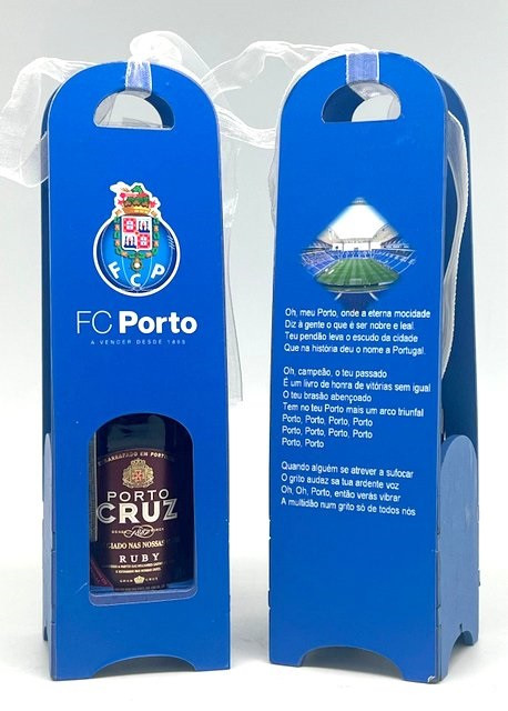 Uma garrafa pequena embrulhada numa caixa alusiva ao FC Porto e com a letra do hino do magnifico