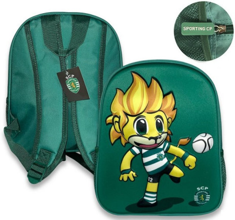 Mochila pré escolar do Sporting Clube de Portugal com o Jubas em 3D com um compartimento principal. Tem duas bolsas laterais em rede para garrafas e as alças são alcochoadas.