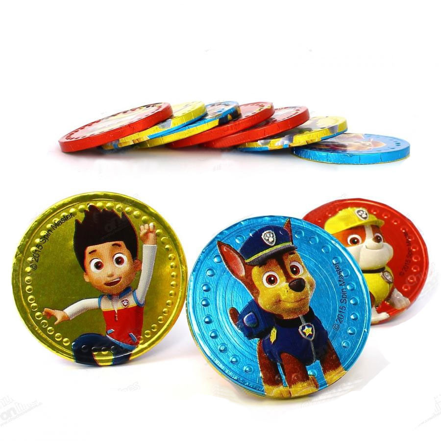 Moeda de chocolate Paw Patrol sortida disponivel em azul, vermelho e amarelo com imagens de todas as personagens da série. Diâmetro: 4cm.Também disponivel em bomboneira de vidro com 175 unidades.NÃO CONTEM GLUTEN NEM ÓLEO DE PALMA.