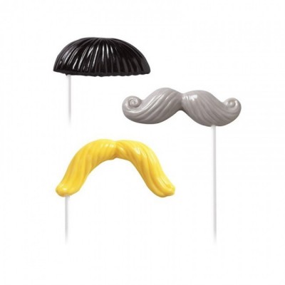 Molde em plástico com 3 design e 3 cavidades para fazer bombons no formato de bigodes.