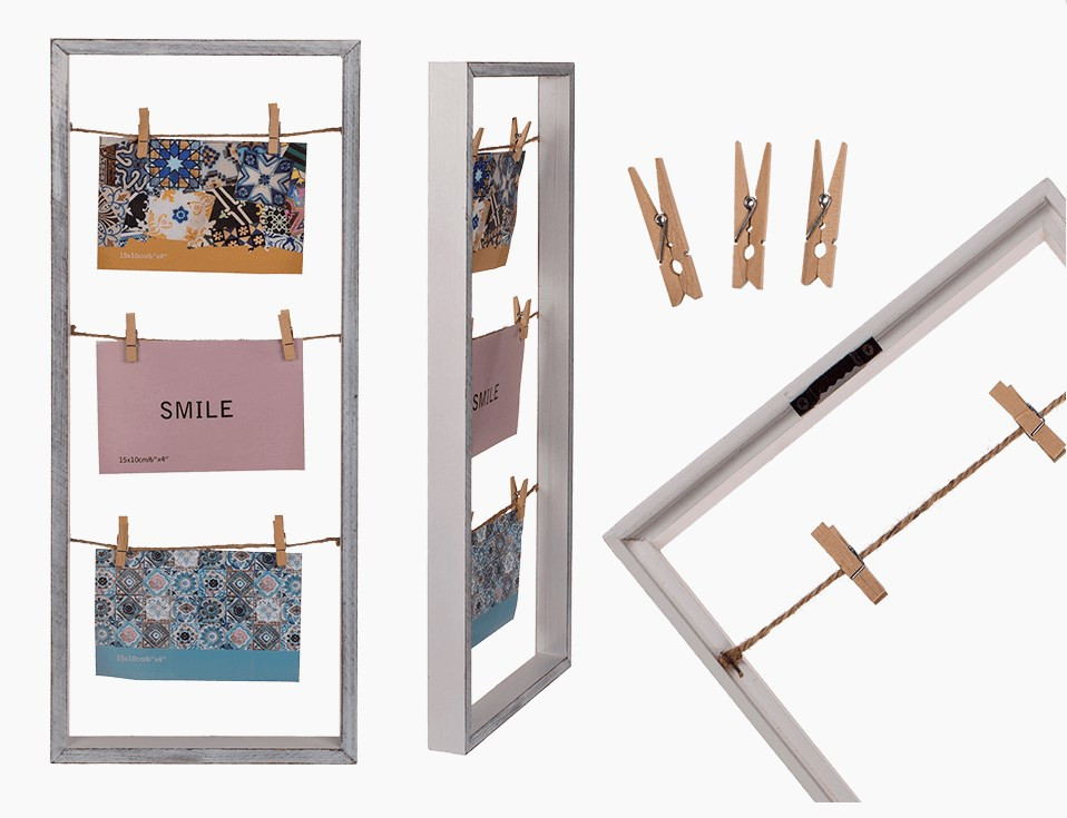 Moldura branca de madeira com capacidade para 3 fotos 15x10cm para pendurar cada uma em sua corda. Inclui 6 mini molas em madeira. Ideal para decorar qualquer festa ou a sua casa.