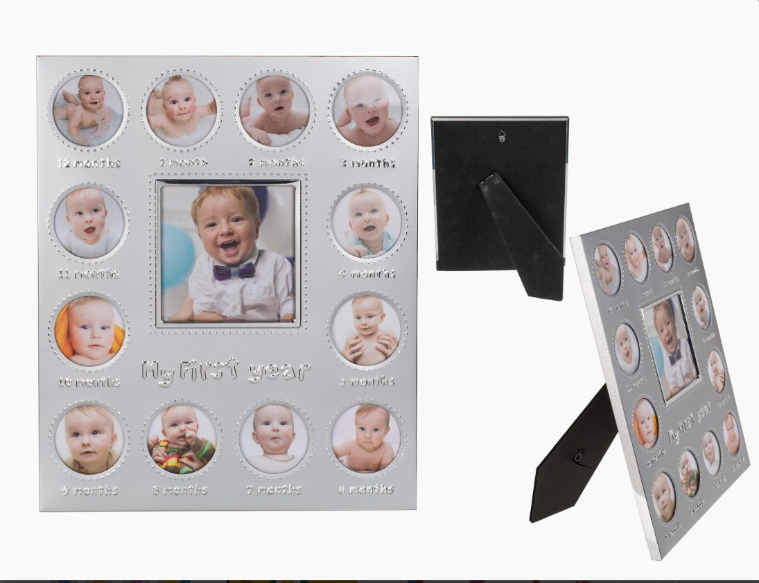 Celebre o primeiro ano de vida do seu pequenote com esta moldura em metal, onde poderá colocar 12 fotos, uma por cada mês e uma foto central. Será certamente algo que quererá recordar.