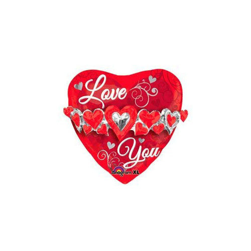 Multi balão foil metálico com a forma de coração e um anel de vários corações. Contém a expressão amorosa inscrita "Love You".