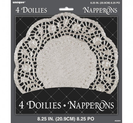 Conjunto de quatro unidades de naperons de papel prateados com 21cm de diâmetro.