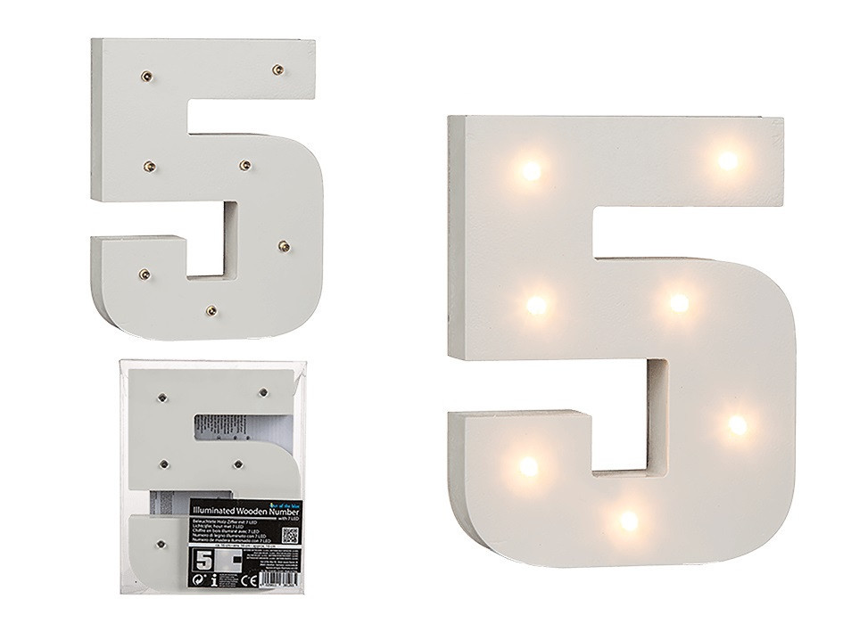 Número 5 com iluminação de 7 Leds com 16cm de altura. Fabricado em MDF este artigo é ótimo para decoração de salas, quartos, aniversários ou outros eventos e pode ser utilizado de dois modos, livre em qualquer superfície ou suspenso na parede.