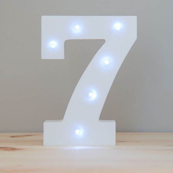 Digito número sete com iluminação Led com 16cm de altura. Fabricado em MDF este artigo é ótimo para decoração de salas, quartos, aniversários ou outros eventos e pode ser utilizado de dois modos, livre em qualquer superficie ou suspenso na parede.