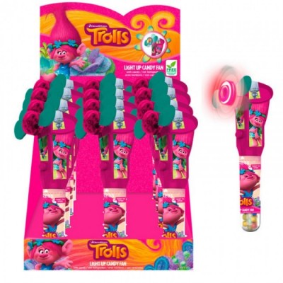 Ovo de chocolate Trolls com brinquedo aleatório, um saco de doces e uma tira de autocolantes no interior.