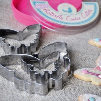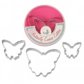 Encantador conjunto de três cortadores em aço inoxidável, em forma de borboleta, devidamente acondicionados em caixa redonda de plastico para a execução de deliciosos biscoitos.Material: Aço inoxidávelDimensões: Comprimento: 10.5 cm, Largura: 10.5 cm, Altura: 2.5 cm