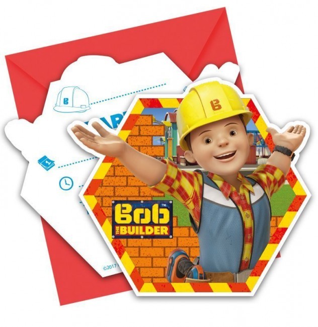Pack de 6 convites de formato quadrado com envelope para as festas de aniversário alusivo ao tema Bob Construtor.