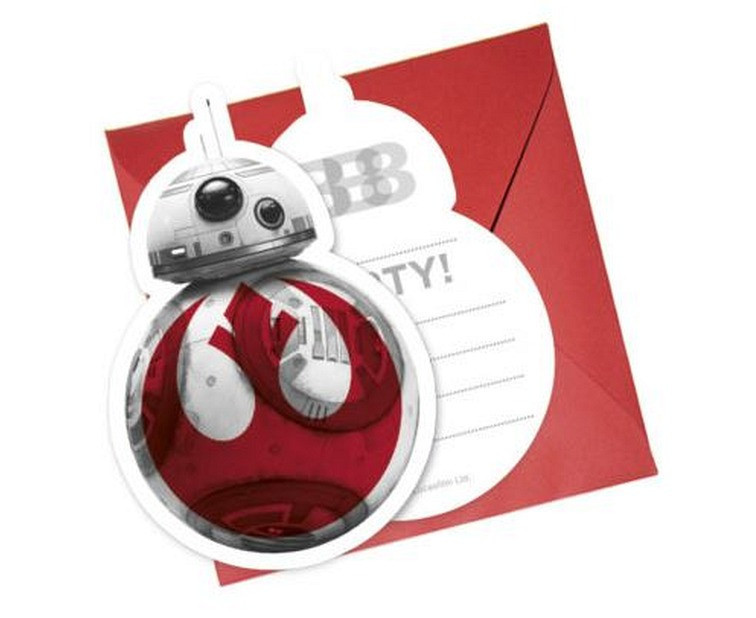 Pack de 6 convites de festas no formato do personagem BB-8 com envelope em vermelho.