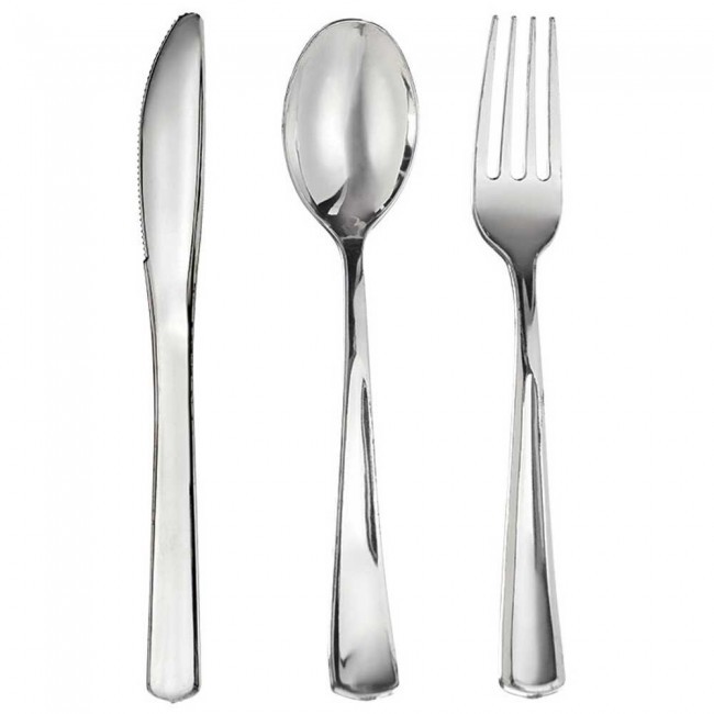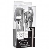 Conjunto de 32 talheres de qualidade superior, em tom prateado, composto por 8 facas; 8 colheres e 16 garfos