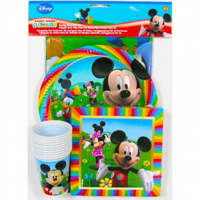 Pack contendo 10 pratos papel 23cm, 10 guardanapos, 10 copos plástico e 1 toalha plástico. Apresentado em bolsa para as festas de aniversário do Mickey Mouse Disney