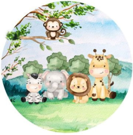 Em lona, em formato redondo, uma tela decorativa para festa de animais safari, animais da selva com a medida de 1.45m de diâmetro.