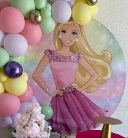 Em lona, em formato redondo, uma tela decorativa para festa de aniversário da Barbie com a medida de 1.45m de diâmetro.