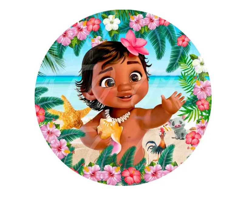 Em lona, em formato redondo, uma tela decorativa para festa da Vaiana da Disney com a medida de 1.45m de diâmetro.